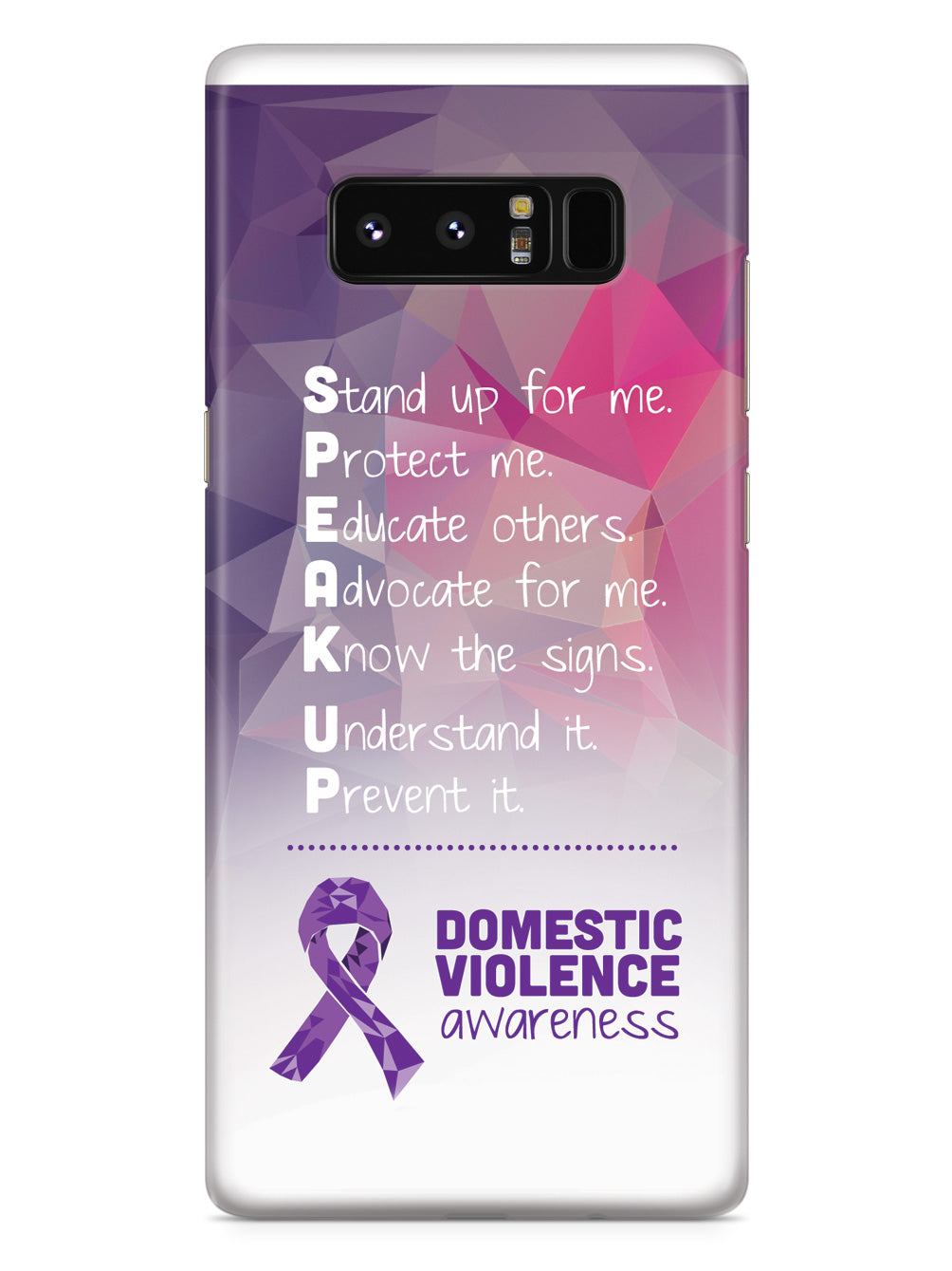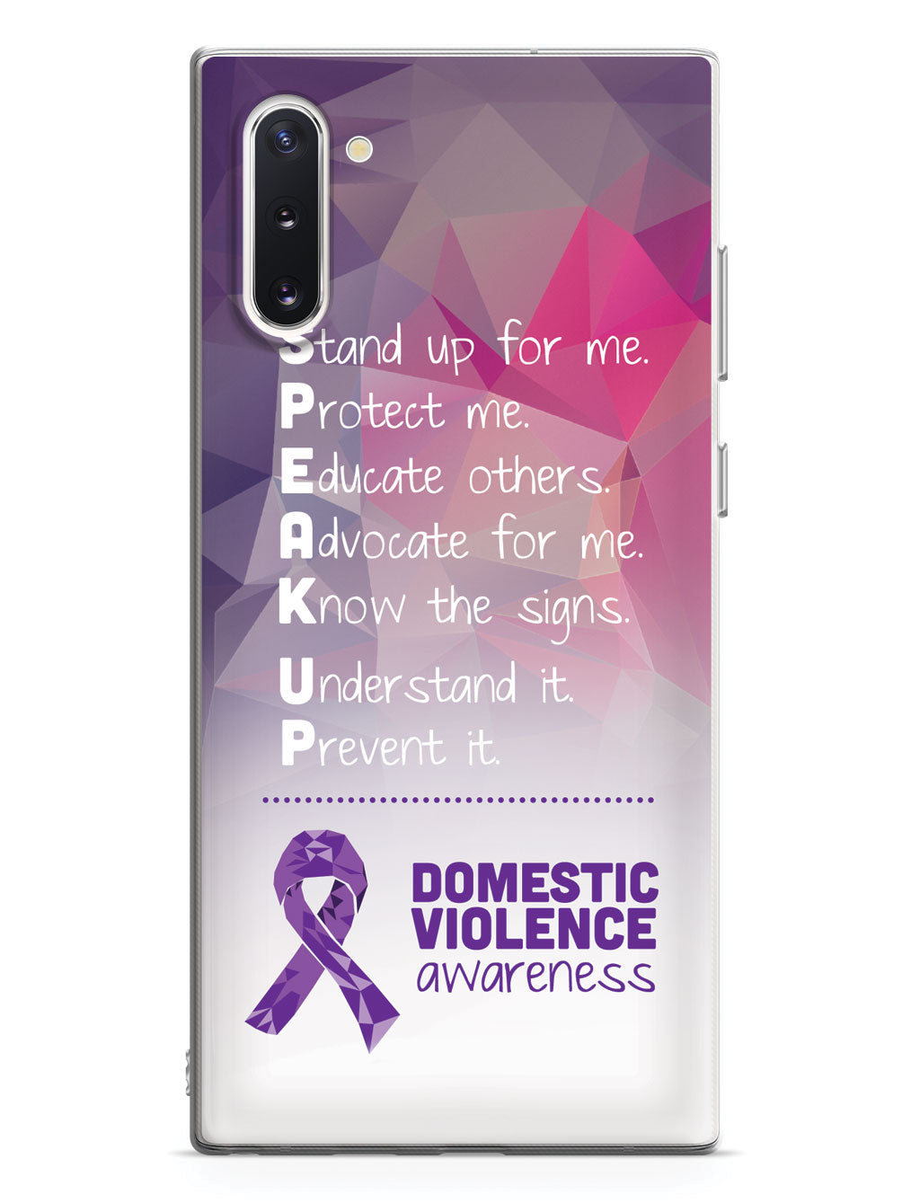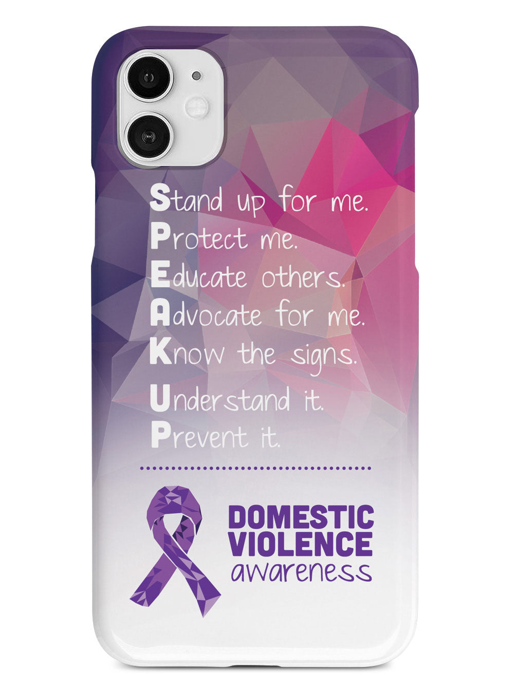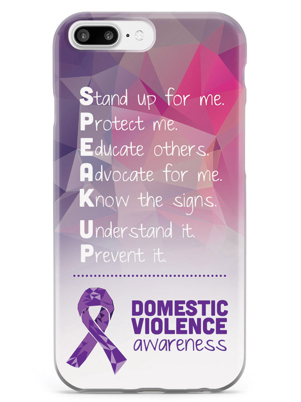 Give your device a unique style all its own. The Domestic Violence Awareness - Speak Up! case was professionally created and printed in the United States to help raise awarenss. A portion of proceeds go to a select cause. Textured printing raises parts of the images, creating a unique feel like no other case!